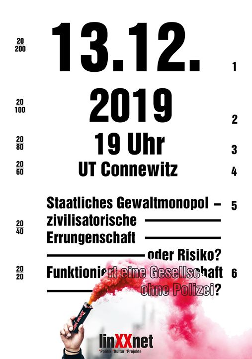 Ist eine Gesellschaft ohne Polizei möglich? Welche Alternativen zur Konzentration des Gewaltmonopols in den Händen einer staatlichen Institution gibt es? Wie kann das Zusammenleben alternativ und gewaltfrei unter Wahrung zivilisatorischer Errungenschaften organisiert werden? Darüber diskutieren Karl-Heinz Dellwo (Autor), Florian Krahmer (Politologe, http://florian-krahmer.de/index.html), ein*e Vertreter*in einer internationalistischen Perspektive und andere. Moderation: Julia Nagel (MdL Die Linke, Sachsen, http://jule-nagel.org).